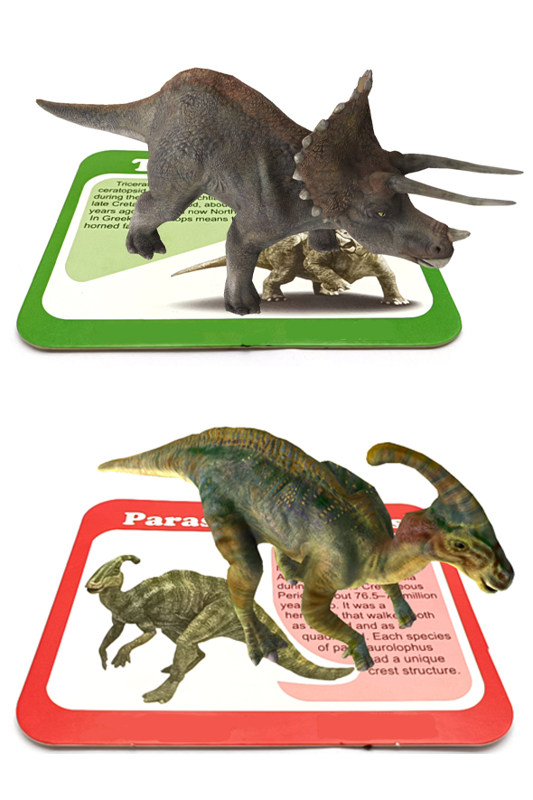 AR flash card is a flashcard which compiled with augmented reality interactive 3D elements that 3D elements match move with flash card. That means if you rotate the flashcard, 3D elements fix on the flashcard and move with the flash card. Children can touch 3D elements and the 3d elements react according to the children interaction.